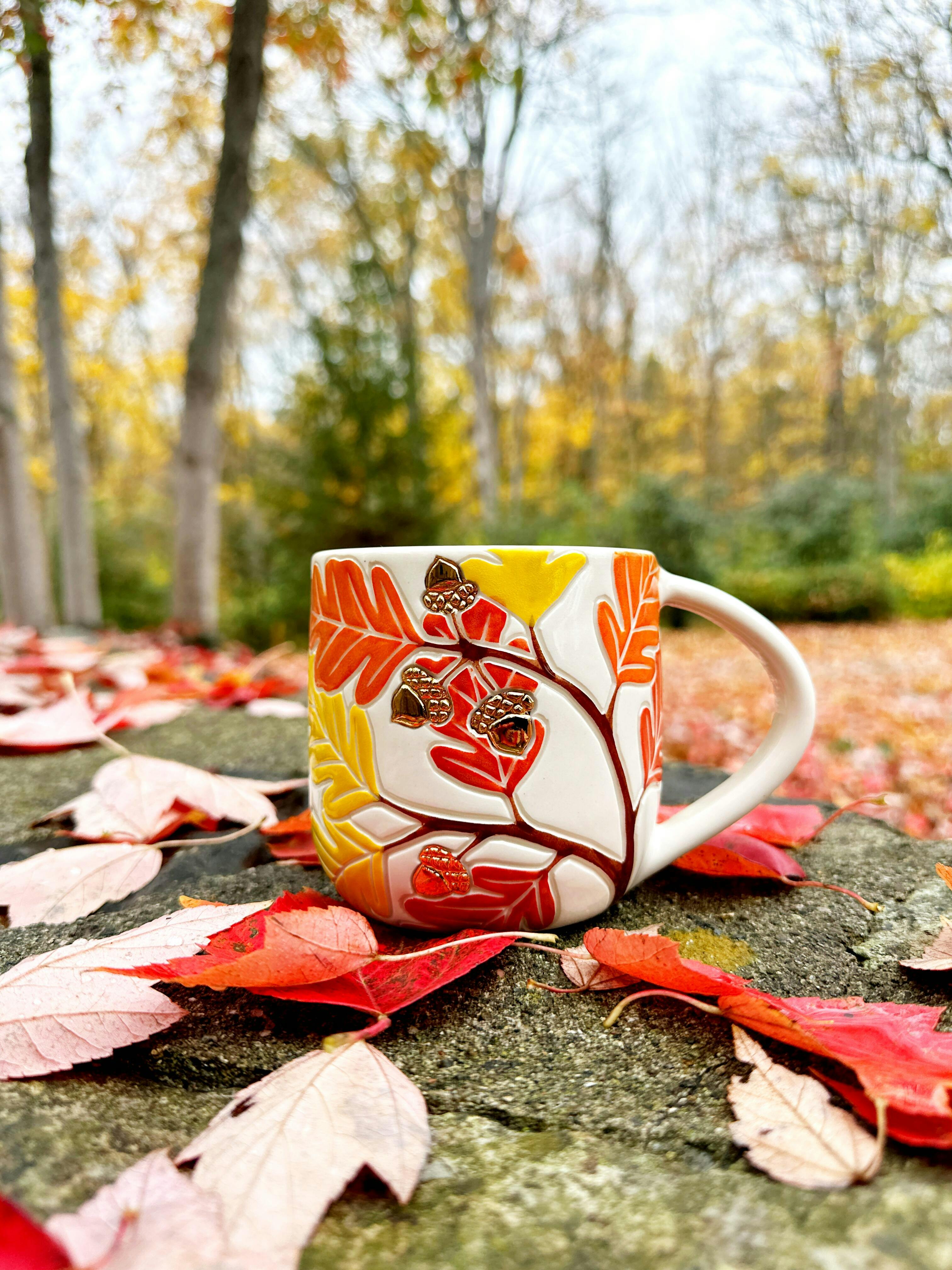 This Mug is hand-thrown from creamy-white porcelain clay and has a hand-painted, hand-carved Autumn Oak Branch design and gold-accented acorns that glitter in the light. All Mugs are glazed with a glossy dishware safe clear glaze.