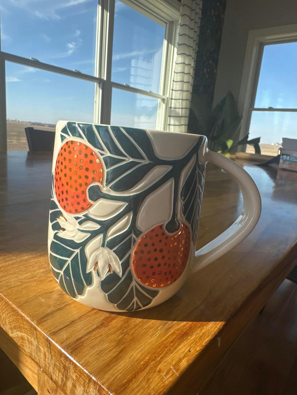 This Mug is hand-thrown from creamy-white porcelain clay and has a hand-painted, hand-carved clementine orange design and gold accents. All Mugs are glazed with a glossy dishware-safe clear glaze.
