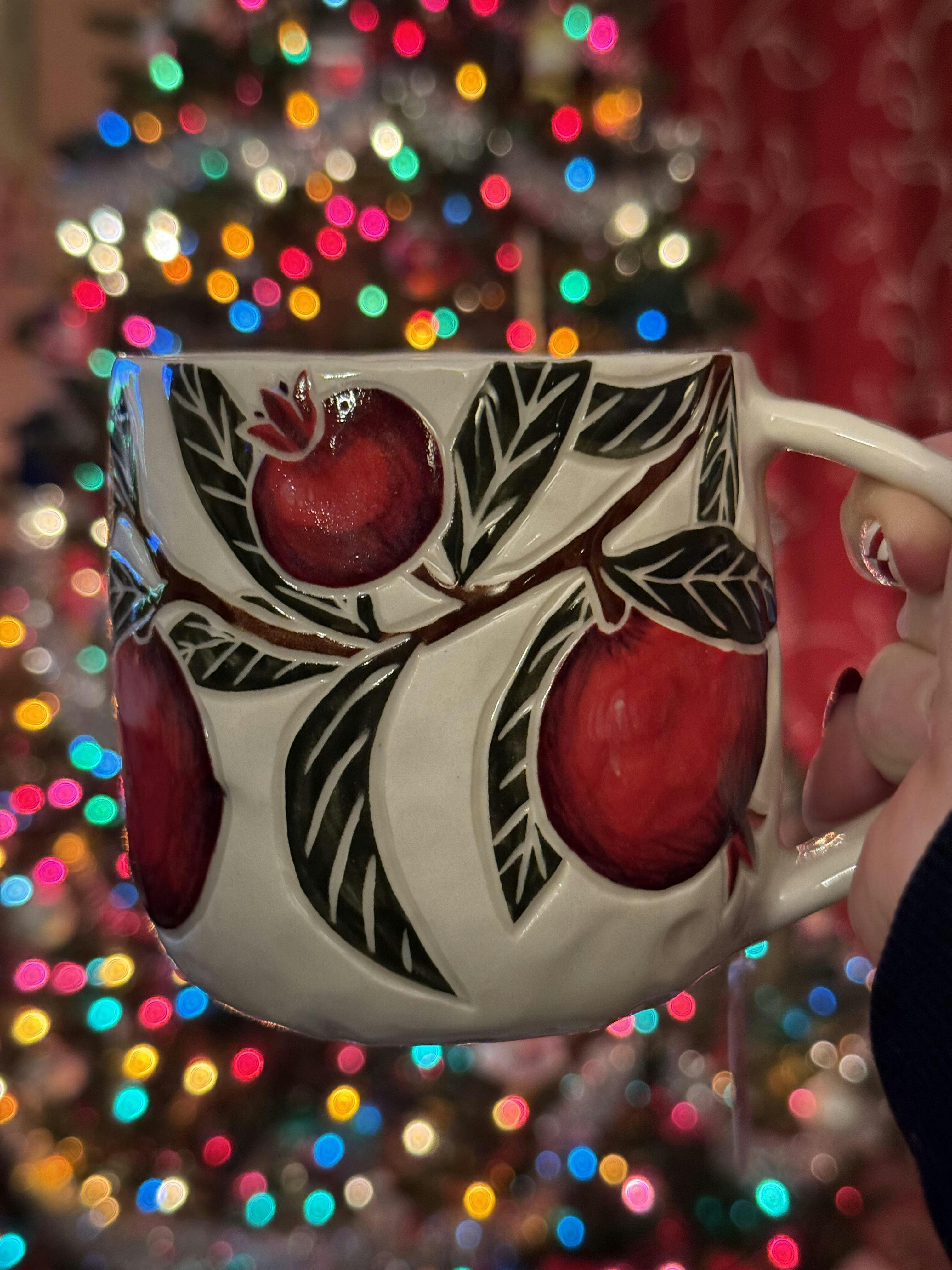This Pomegranate mug is hand-thrown from creamy white porcelain clay and has a pinched texture. Shiny red pomegranates hang from branches that wrap around the mug. They are positively full of cheer! The mug is glazed with a clear, glossy, dinnerware-safe glaze.