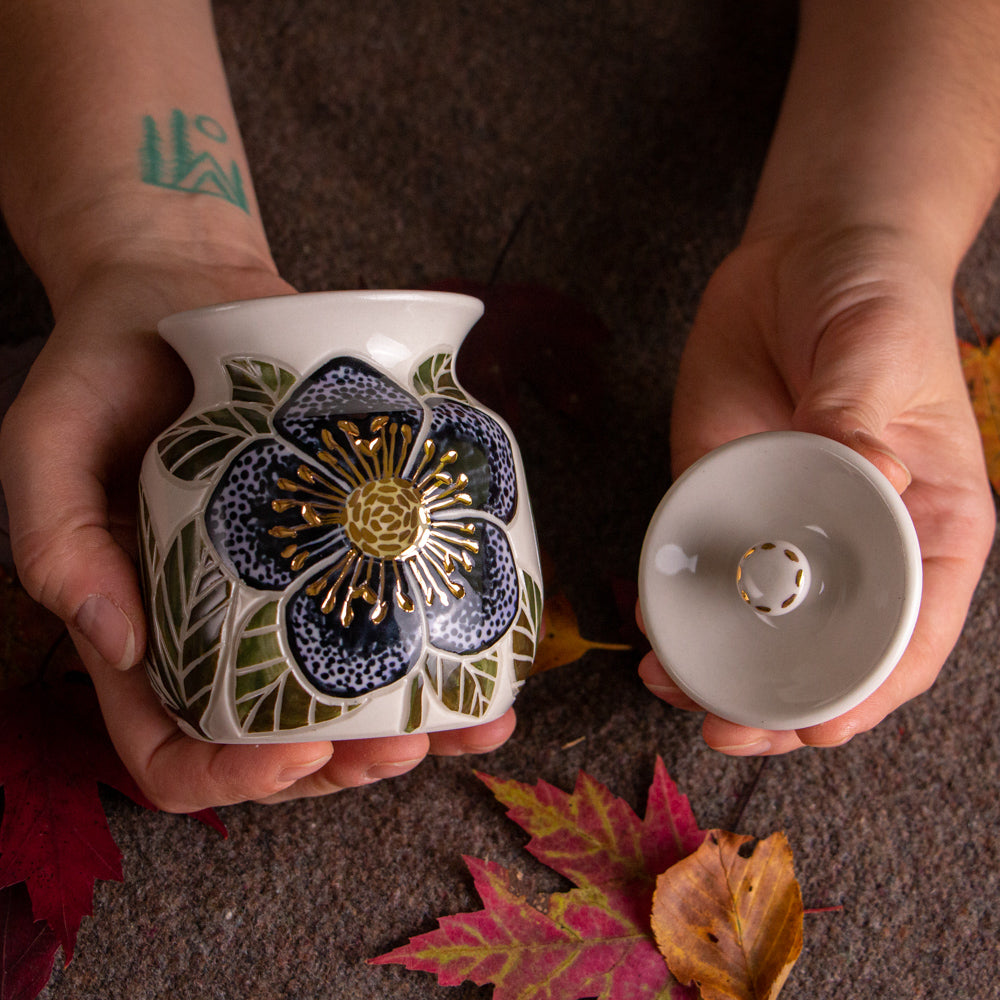This Lidded Jar is hand-thrown from creamy-white porcelain clay and has a hand-painted, hand-carved hellebore botanic design and gold accents. It is glazed with a glossy dishware-safe clear glaze.