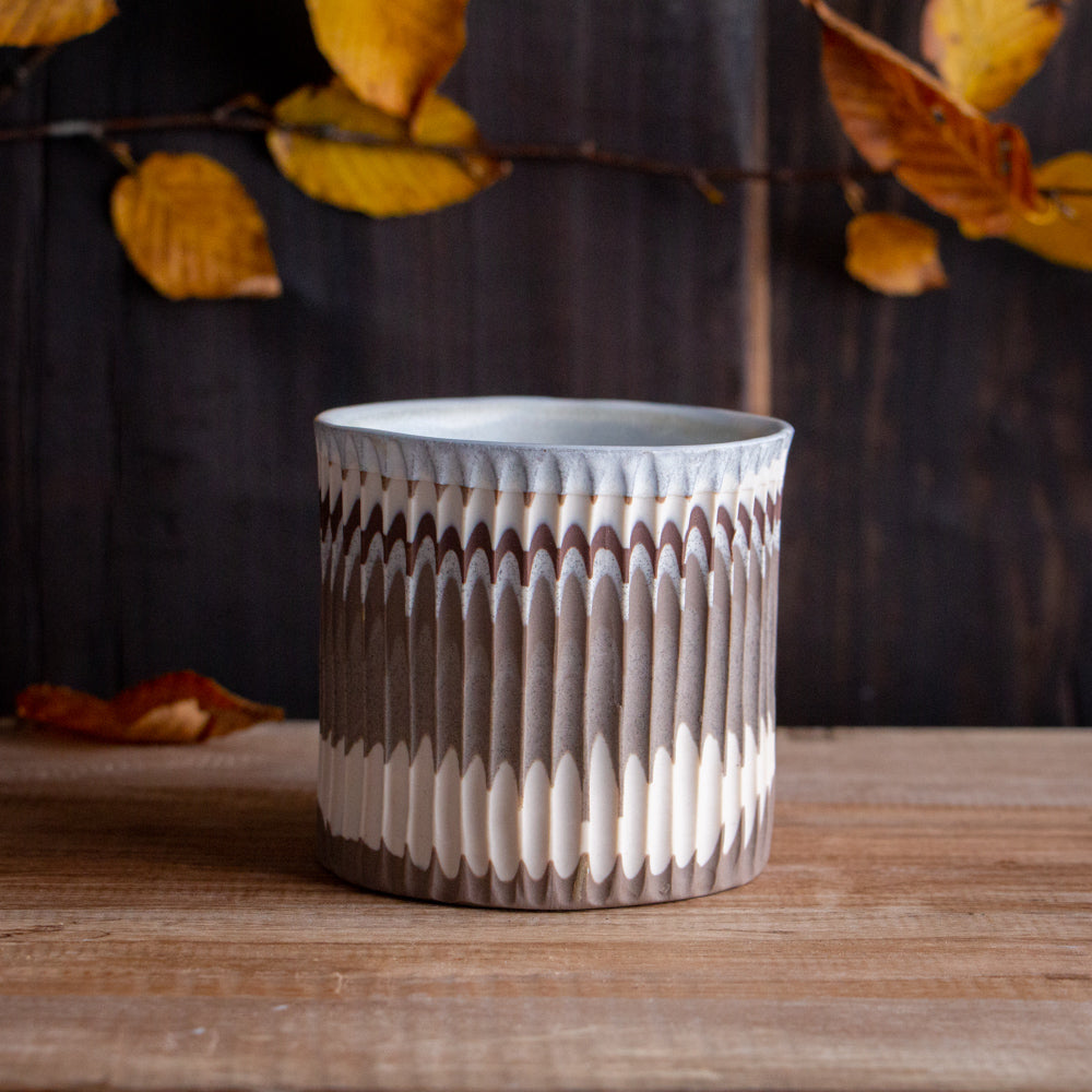 This Mug is hand-built from tinted porcelain clay. Various shades of iron oxide clay are marbled together and carved out to form this Desert Trail Design. This mug is glazed on the inside and handle with a satin white glaze. It is dishwasher and microwave-safe.