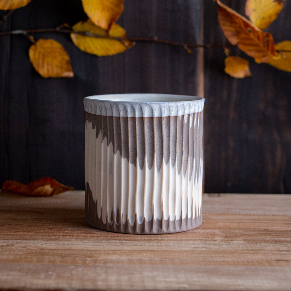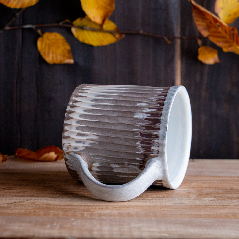 This Mug is hand-built from tinted porcelain clay. Various shades of iron oxide clay are marbled together and carved out to form this Desert Trail Design. This mug is glazed on the inside and handle with a satin white glaze. It is dishwasher and microwave-safe.