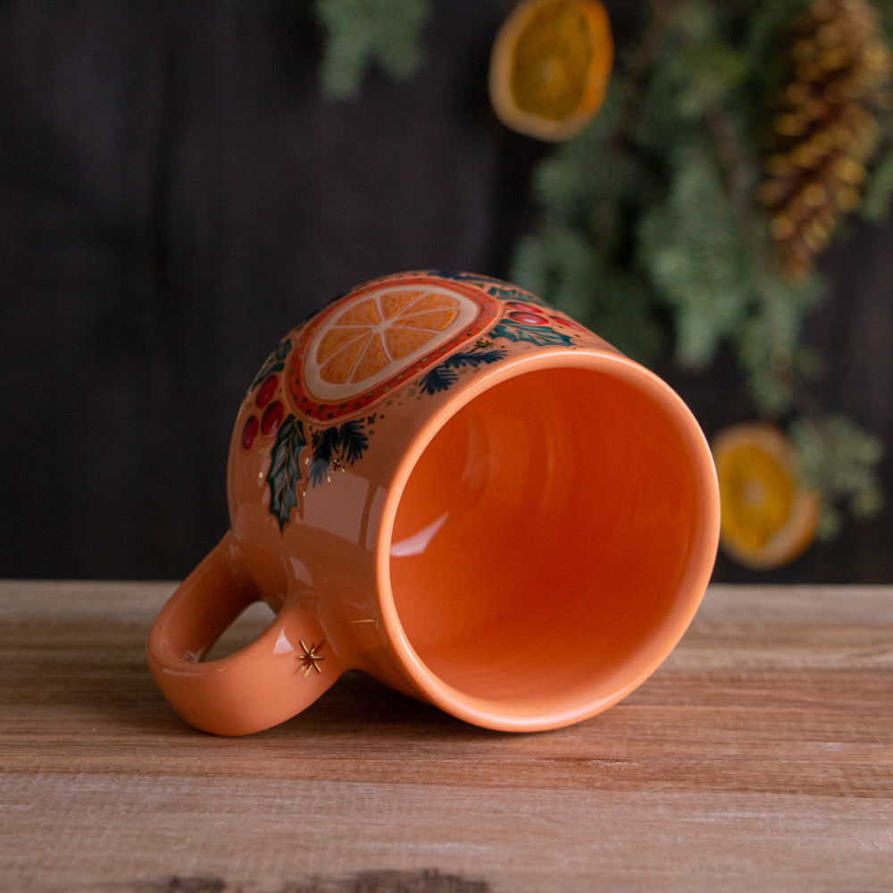 This holiday mug is hand-thrown from peach-stained porcelain clay. On the front, a hand-painted orange slice is surrounded by holly and spruce, with gold accents, and has a sweet holly berry branch on the back of the mug. The mug is glazed with a clear, glossy, dinnerware-safe glaze. The bottom is stamped and marked "Orange Slice 2025".