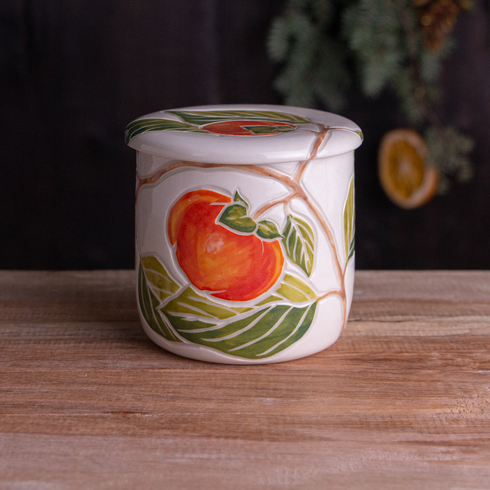 This Butter Keeper is hand-thrown from creamy-white porcelain clay and has a hand-painted, hand-carved Persimmon Branch design. It is glazed with a glossy dishware-safe clear glaze.