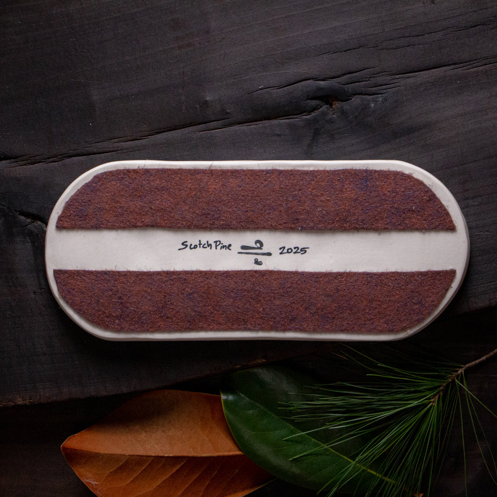 This mancala board is hand-built with creamy-white porcelain and hand-decorated with our Scotch Pine Design. These have 12 small wells in the center and 2 large ones on either end. I've made tiny green and brown hand-faceted clay beads to play and score the game. 48 beads are necessary for the game but I've included 58 in case some go missing.