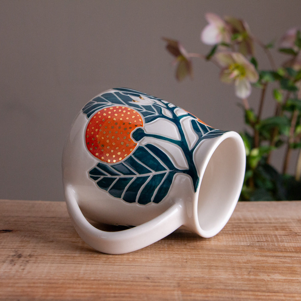 This Mug is hand-thrown from creamy-white porcelain clay and has a hand-painted, hand-carved clementine orange design and gold accents. This mug is stein-shaped, and the design wraps around the piece. All Mugs are glazed with a glossy dinnerware-safe clear glaze.
