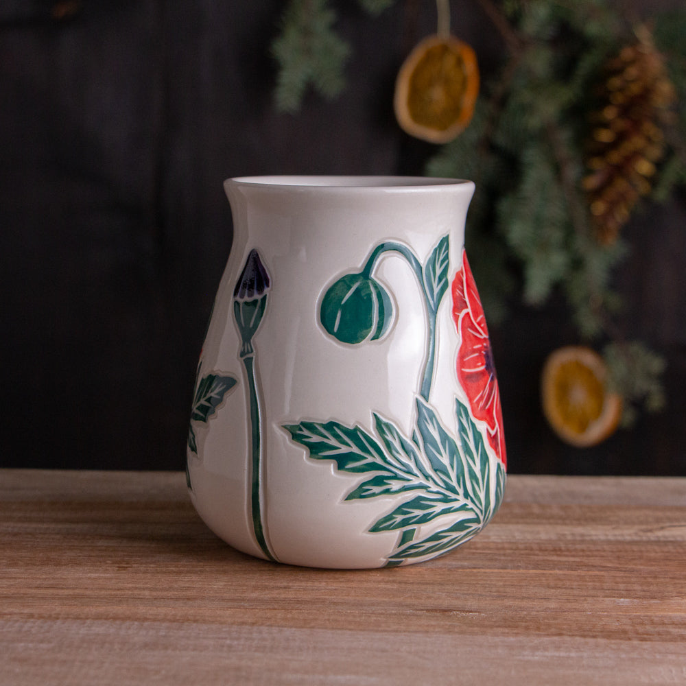 This Mug is hand-thrown from creamy-white porcelain clay and has a hand-painted - hand-carved orange poppy design. This mug is stein-shaped, and the design wraps around the piece. All Mugs are glazed with a glossy dinnerware-safe clear glaze.